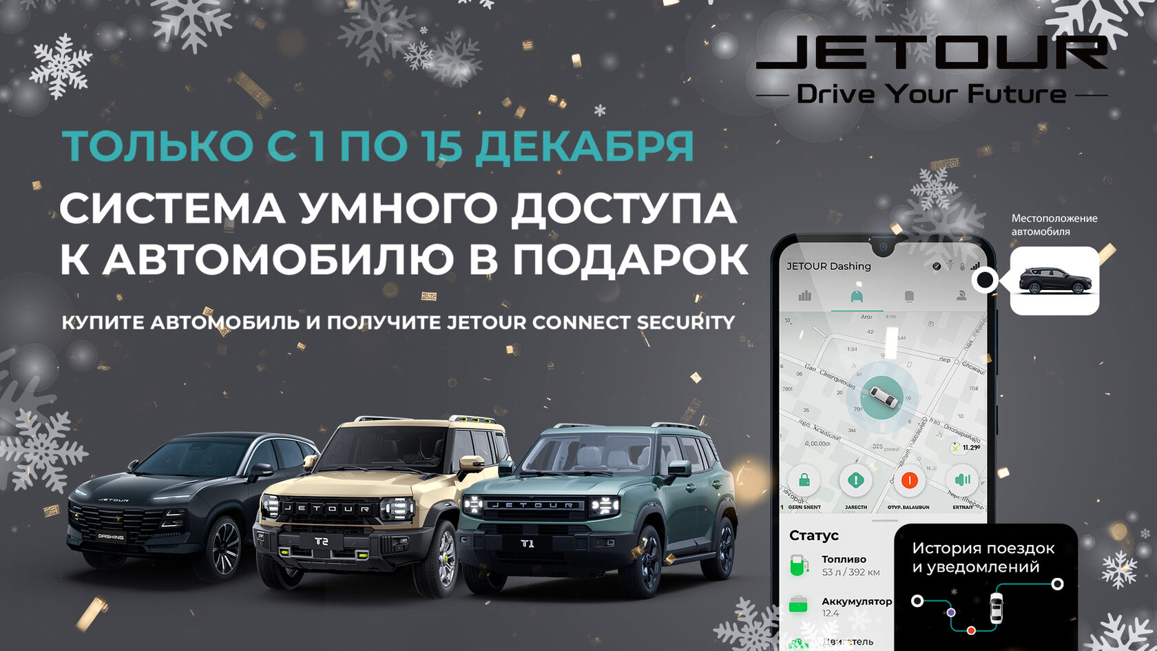 JETOUR объявляет о проведении специальной акции для всех новых клиентов автомобилей бренда. При покупке любой модели JETOUR с 1 по 15 декабря 2025 года каждый клиент, оформивший договор, полностью оплативший автомобиль и подписавший акт приема-передачи автомобиля в указанный период, получит телематическую систему JETOUR CONNECT SECURITY с установкой.